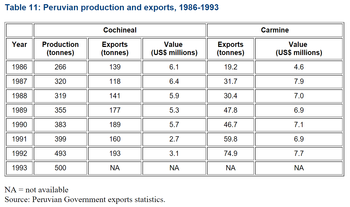 This page says "Total demand in 1995 was estimated to be in excess of 300 tonnes of cochineal per annum. Peru has been the dominant exporter for several decades, accounting for 90% or greater of the export market." The following figure from the same source shows somewhat higher total-production numbers from Peru alone:h